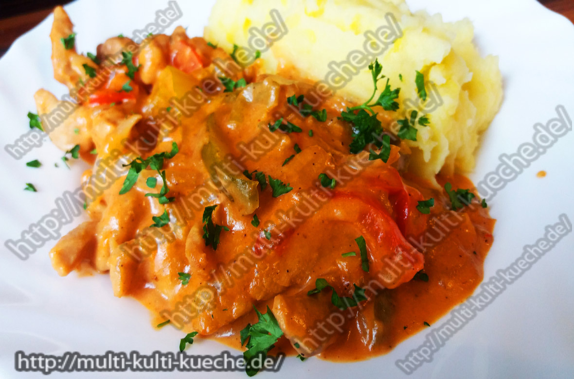 Das in Mundgerechte stücke geschnittene Fleisch und die Zwiebeln darin anbraten.