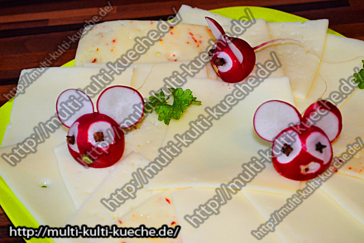 Je ein Stück von den ausgeschnittenen Zacken in die Mozzarella kugeln drücken und die Kugel mit einem Zahnstocher vorne an der Gurke befestigen.