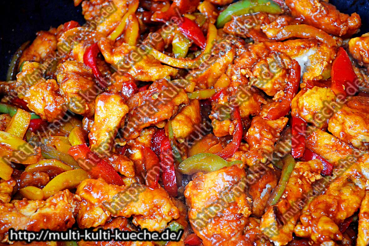 Die Hähnchenbrust in Mundgerechte Stücke schneiden.