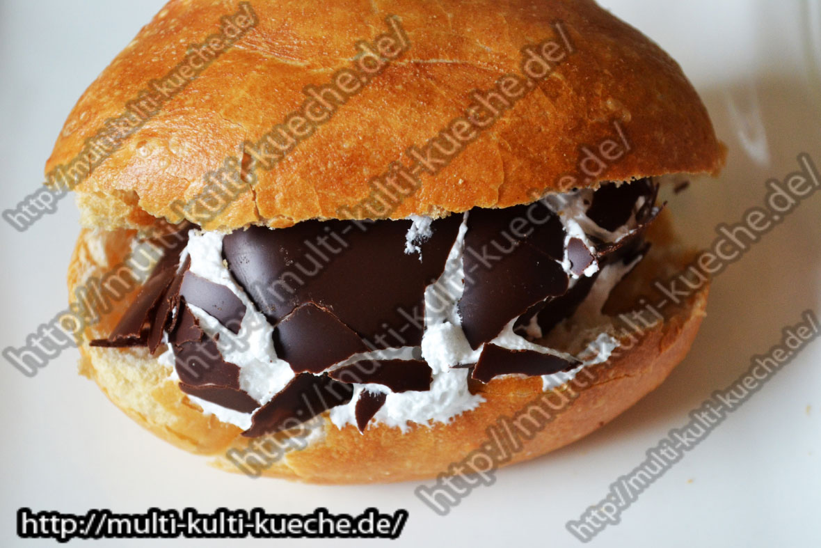 Dann erst den restlichen Puderzucker dazugeben und danach die Dickmann’s vom Waffelboden abtrennen und unter die Sahne mischen.