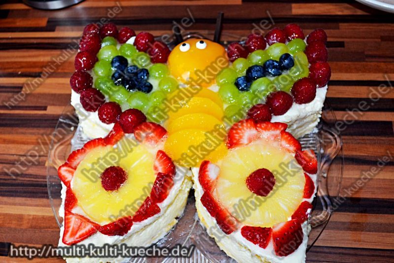 Zutaten Schmetterling Käse Sahne Torte Für den Tortenboden5 Eier150g Mehl150g Zucker1 Päck. Vanillezucker Für BelagVerschiedene Früchte1 Päckchen TortengussZuckeraugen2 Mikado Sticks für die Fühler Für die Creme3 Eigelb180g Zucker250ml Milch600ml Sahne350g Quark1,5 Päck Sofortgelatine Zubereitung für Käse Sahne Torte Die Eier mit dem Zucker und dem Vanillezucker cremig schlagen. Dann das […]